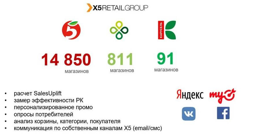 Помимо клиентской базы данных, X5 Retail Group разработали специальный инструмент учета и статистики — SalesUplift. С его помощью измеряется эффективность рекламы, которая запущена на аудиторию X5 Retail Group.