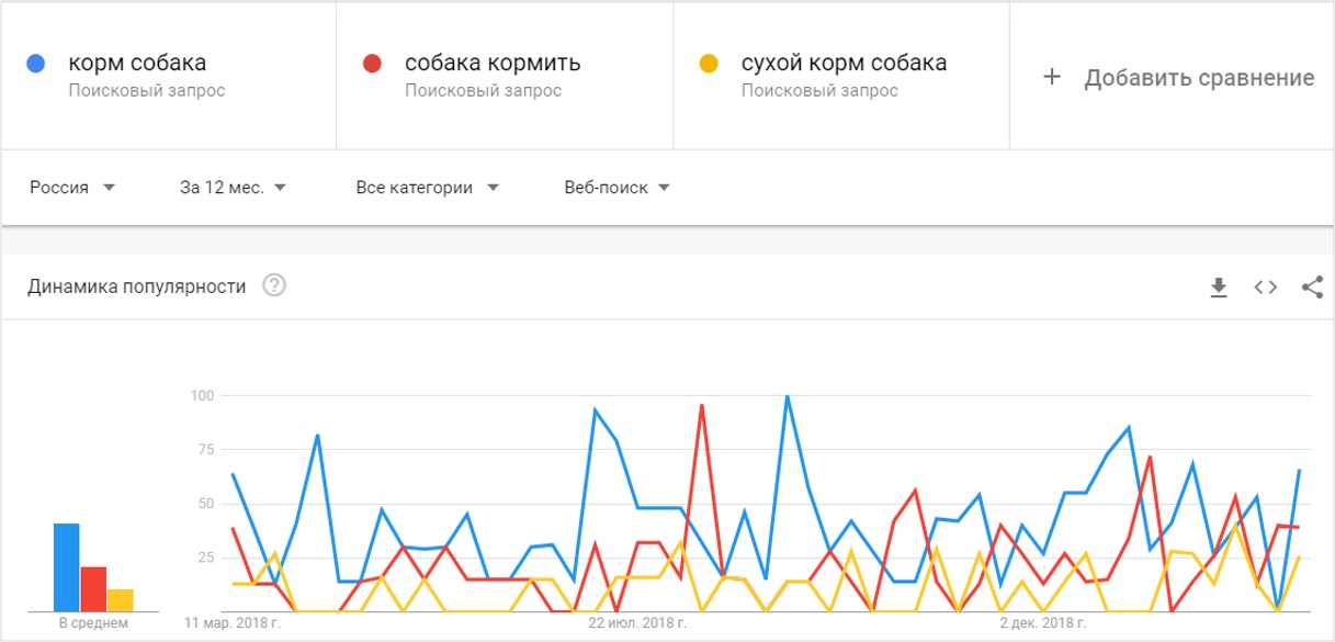 Динамика запросов за 12 месяцев по тематике «Корма для собак» по данным Google Trends