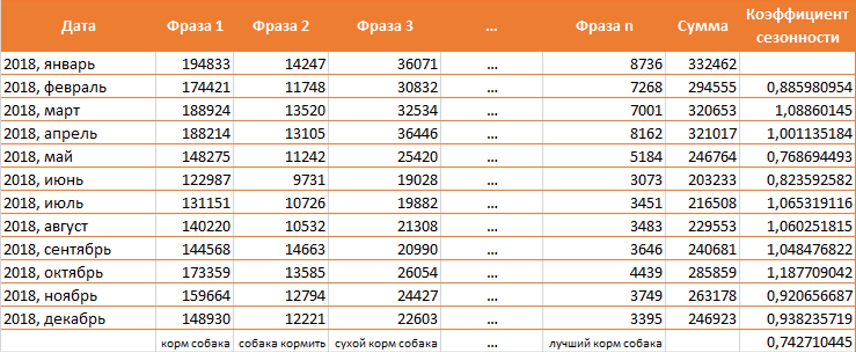 - По каждой фразе собираем объем за прошедший год по месяцам и суммируем по всем фразам за каждый месяц.