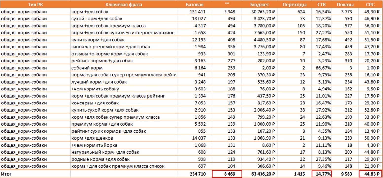 На этом этапе мы можем внести все данные в общую таблицу и оценить бюджет на привлечение всего потенциального трафика. Если сумма превышает допустимые границы, на следующих этапах нужно скорректировать объем трафика по CPO или другим целевым KPI.