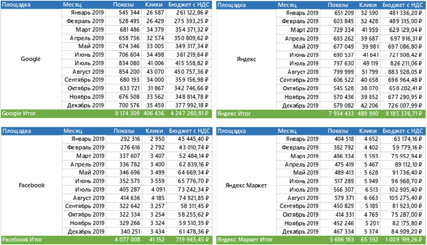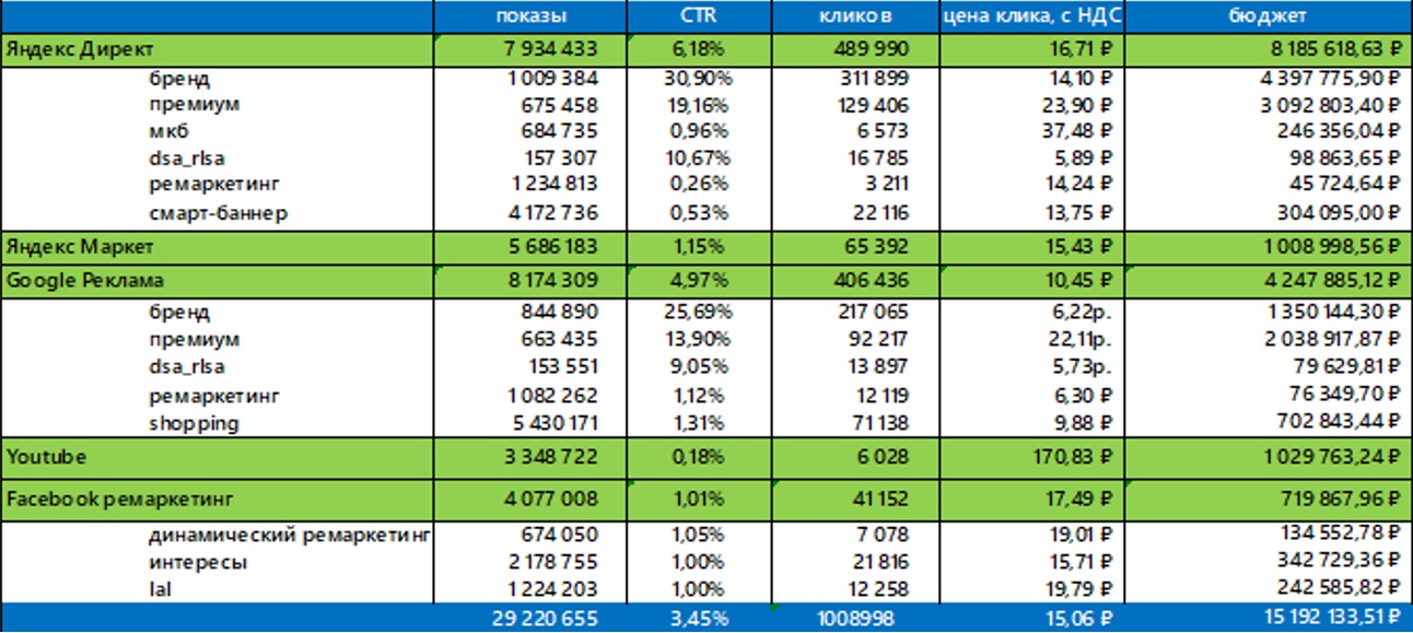 - рекламный бюджет и его структуру в разрезе площадок Яндекс, Google и дополнительных каналов.