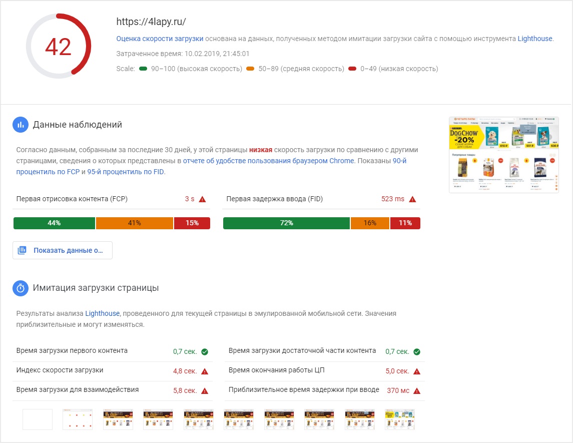 Чтобы рассчитать объем целевых действий, мы проводили аудит сайта. В первую очередь проанализировали скорость загрузки сайта и ее главный показатель — время загрузки первого контента.
