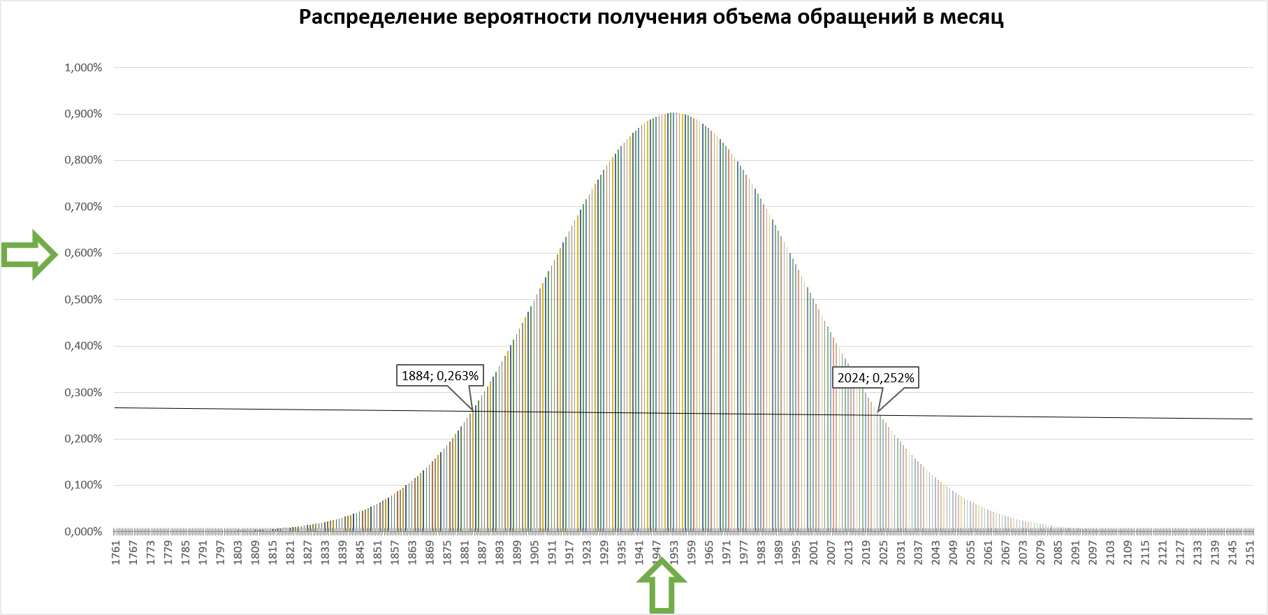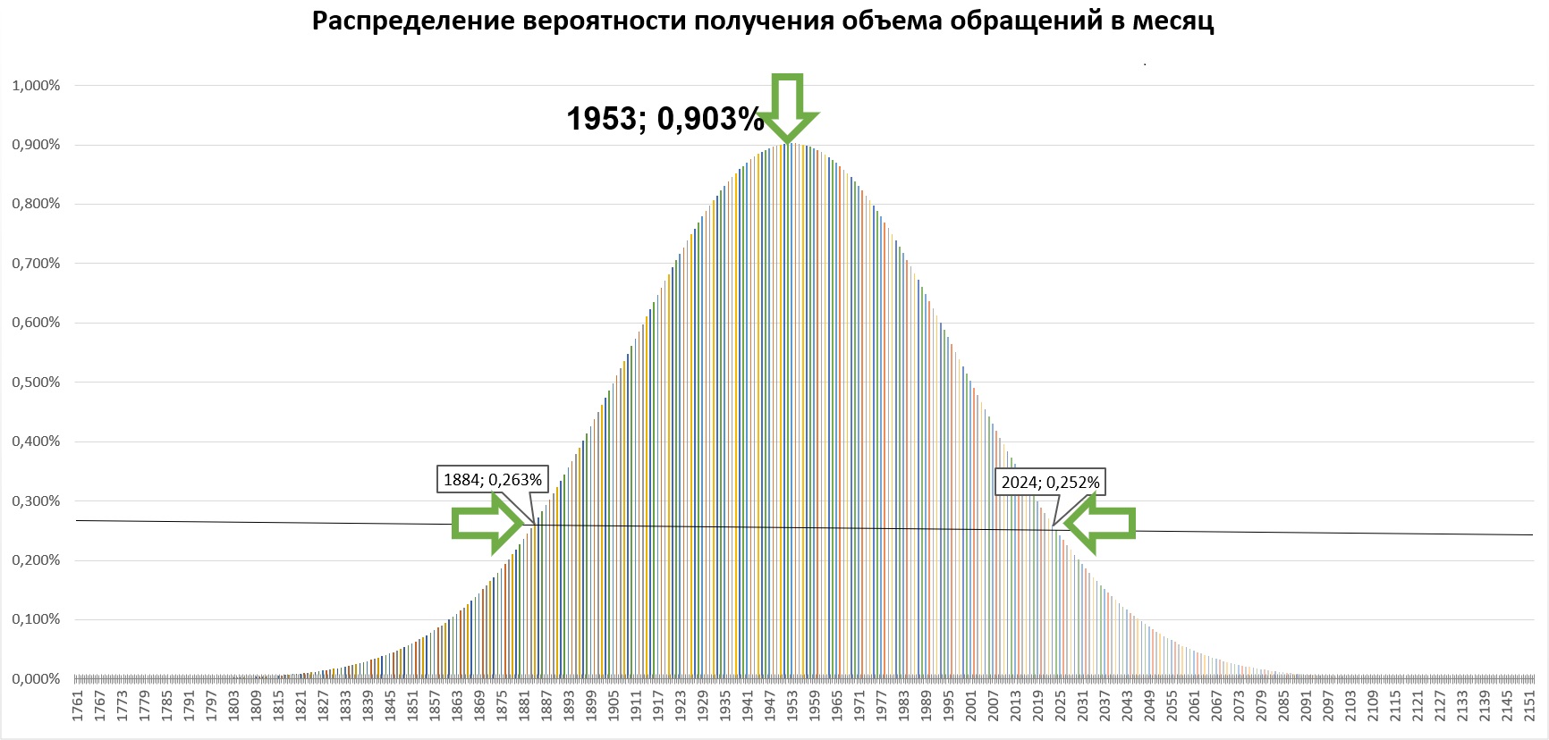Принимаем расчетный прогноз количества конверсий за среднее ожидаемое количество целевых действий. Это пик графика. Значения в примере — 1953 конверсии с вероятностью 0,903%.