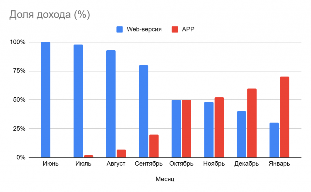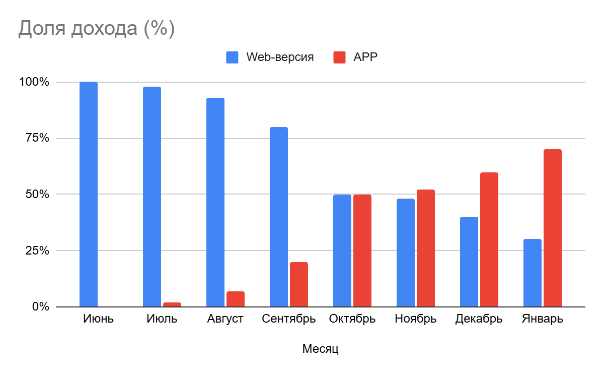 Если на старте приложение рассматривалось как точка роста, то по итогам продвижения его вклад в экономику бизнеса существенно изменился: до 70% всей выручки стало формироваться именно в app-канале.