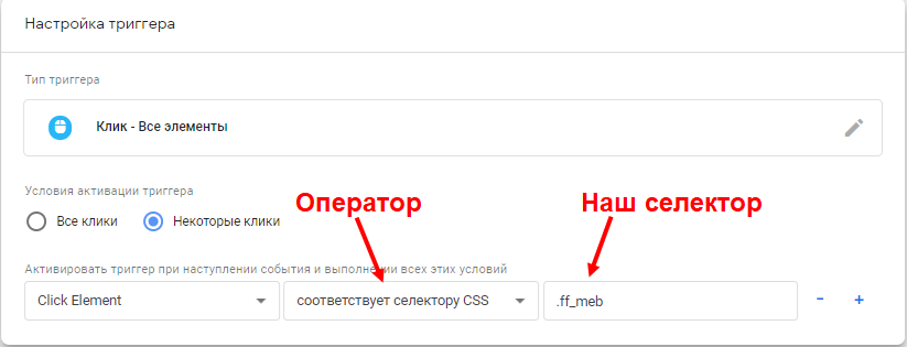 В нашем случае отслеживаемый элемент имеет уникальный класс ff_meb, соответственно, селектор CSS будет: .ff_meb. Точка в этом случае обозначает, что это класс.