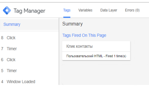 Шаг 10: Обновите страницу сайта и кликните на «‎Контакты». Если ваш тег отображается в разделе Tags Fired On This Page, значит, что тег срабатывает при нажатии соответствующей кнопки.