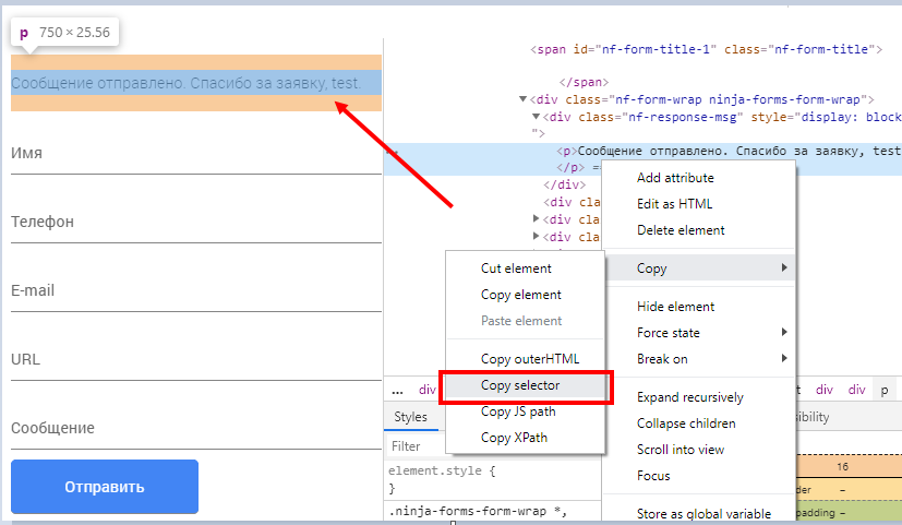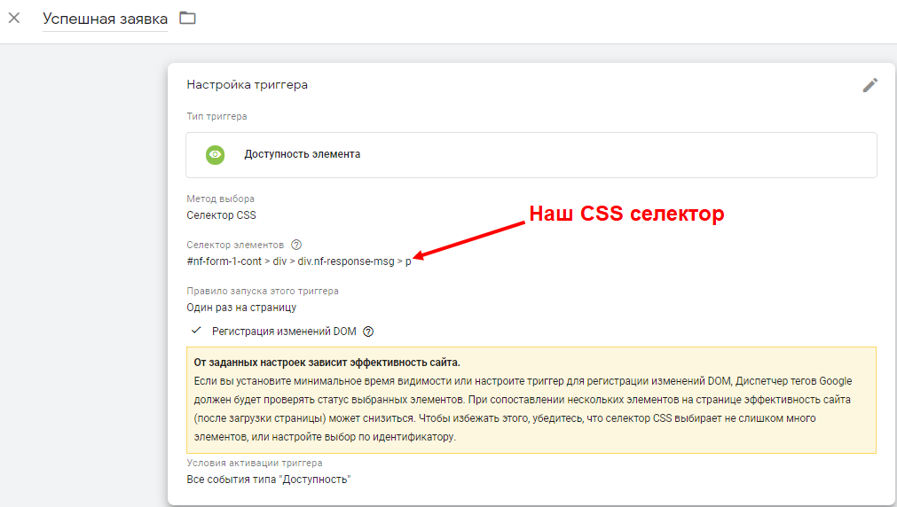 В нашем случае отслеживаемый элемент имеет уникальный ID #nf-form-1-cont, соответственно, селектор CSS будет: #nf-form-1-cont > div > div.nf-response-msg > p. Решетка в данном случае обозначает, что это ID элемента.