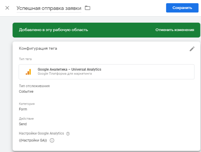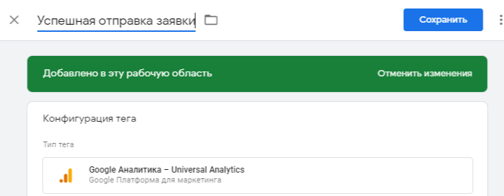 Шаг 5: Перейдите к своей учетной записи GTM и создайте новый тег типа Universal Analytics. Назовите его «Успешная отправка заявки».