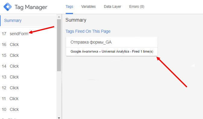 Шаг 11: Ниже в отладчике вы увидите теги, которые сработали на этой странице. Если тег отображается в разделе Tags fired on this page‎, значит, что он срабатывает при успешной отправке формы.