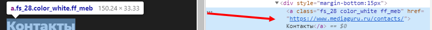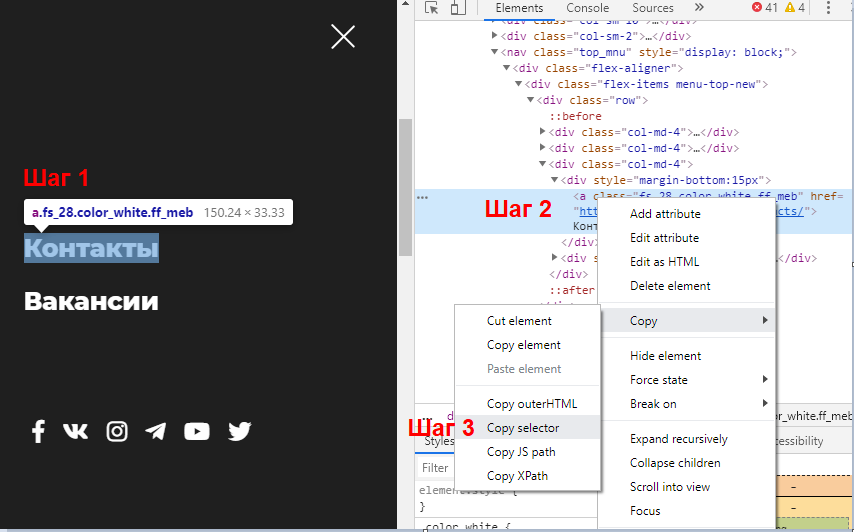 1. Кликните правой кнопкой на элемент (Контакты) → Просмотреть код. Откроется консоль разработчика.