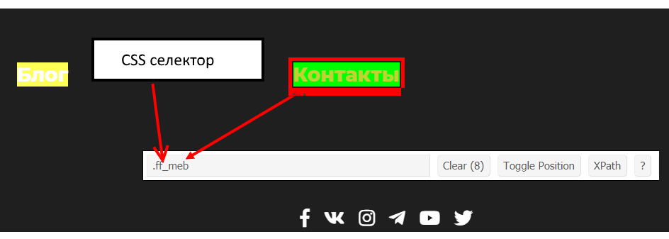 Шаг 4: Теперь нажмите на «Контакты» и скопируйте соответствующий селектор CSS, который отобразился в инструменте «SelectorGadget»: