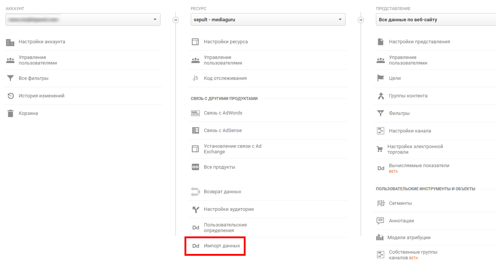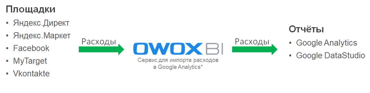 1. Импортировать расходы (клики, показы) из рекламных площадок (Яндекс.Директ, ВКонтакте, MyTarget, Facebook Ads, Criteo, Яндекс.Маркет и т.д.) в Google Analytics для работы с данными в одном окне.
