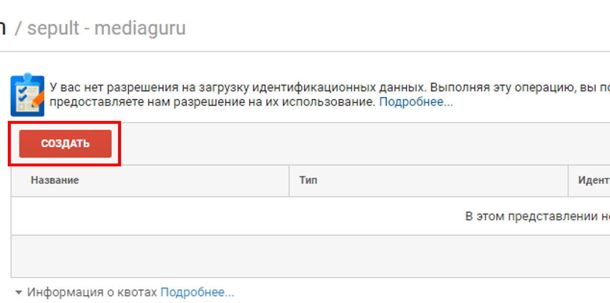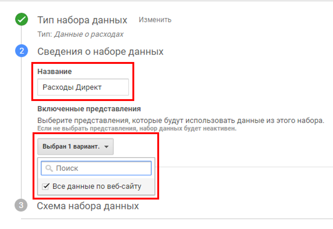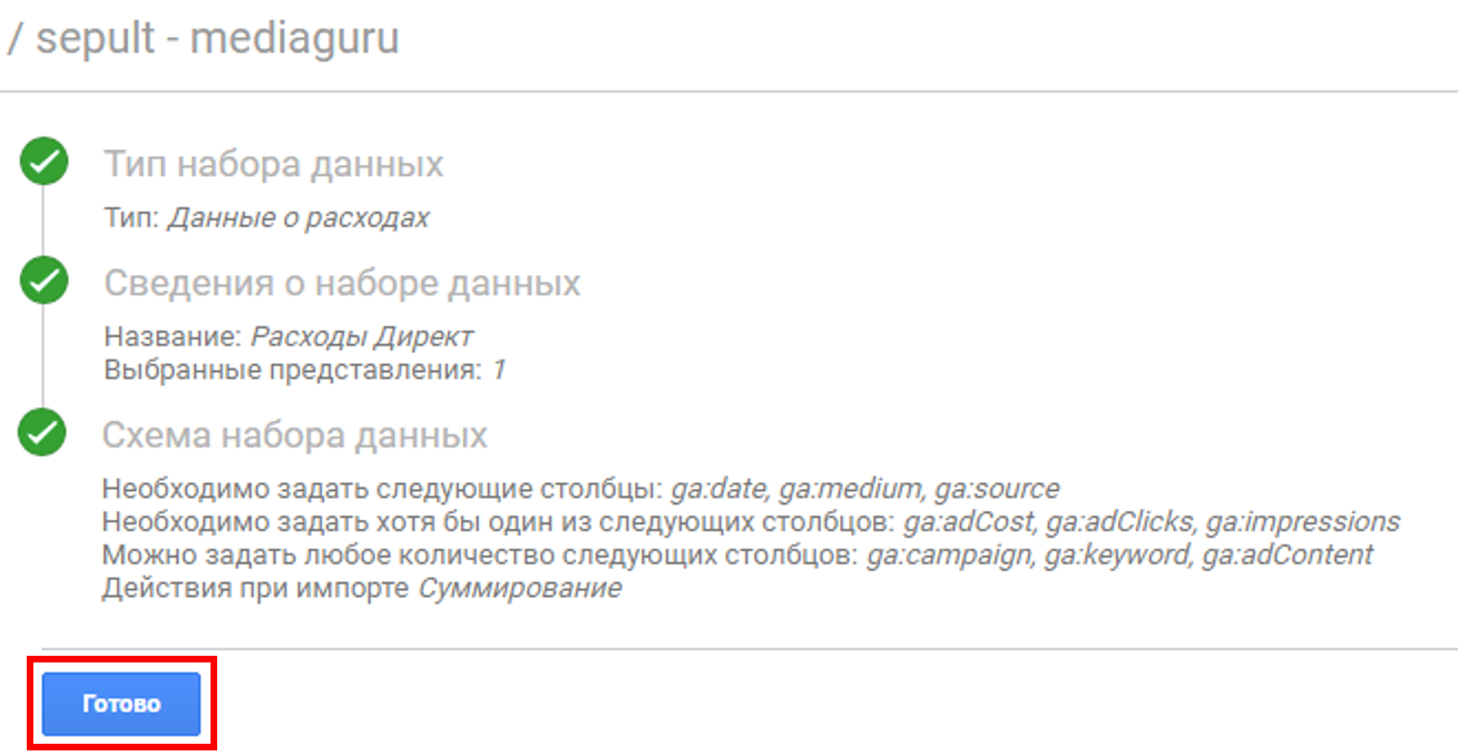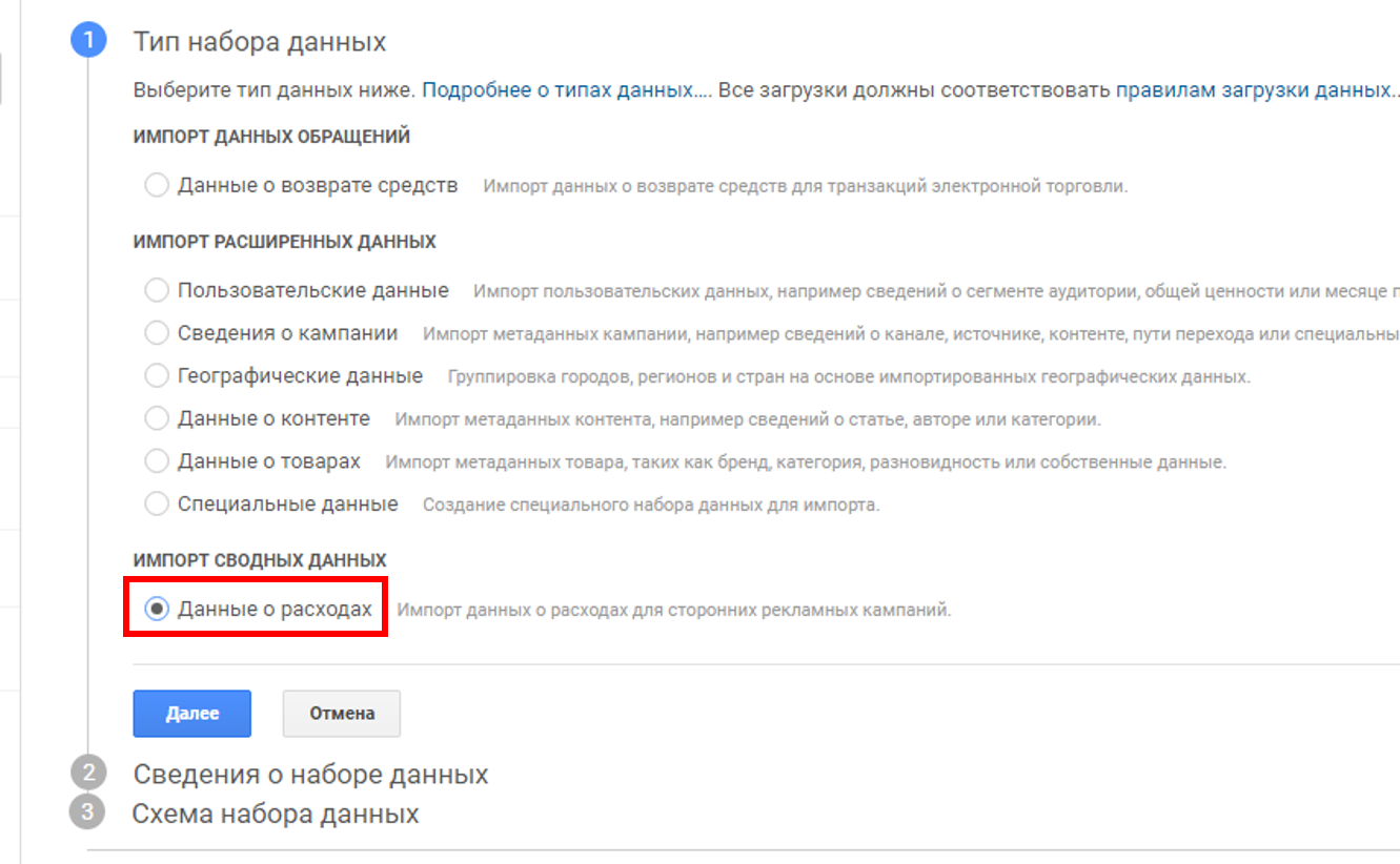 Создаем набор данных о расходах в Google Analytics, куда они будут поступать.
