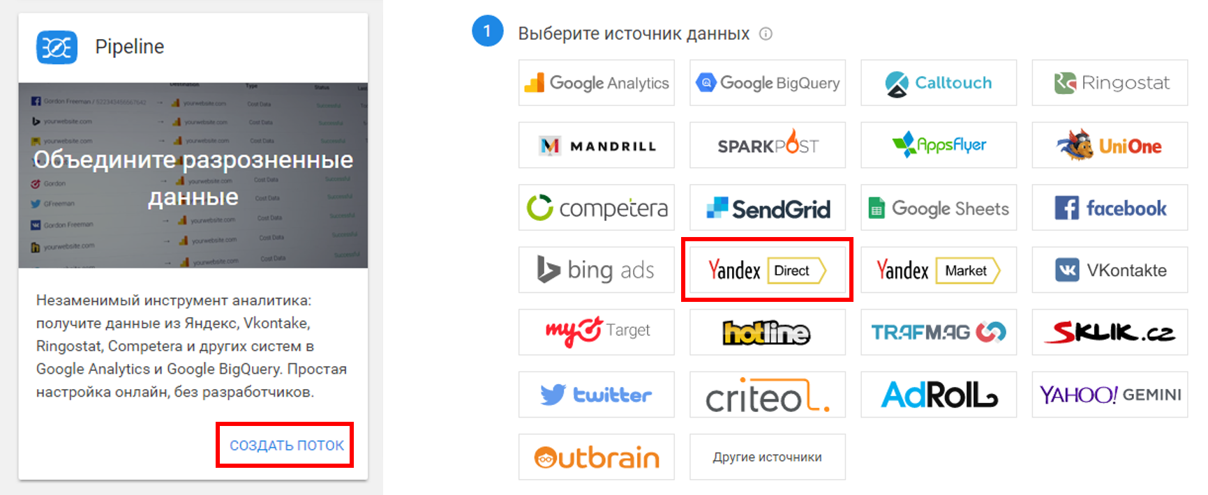 1 ресурс = 1 поток. Создать один поток на импорт расходов из Яндекс.Директа, Маркета и Facebook — нельзя.