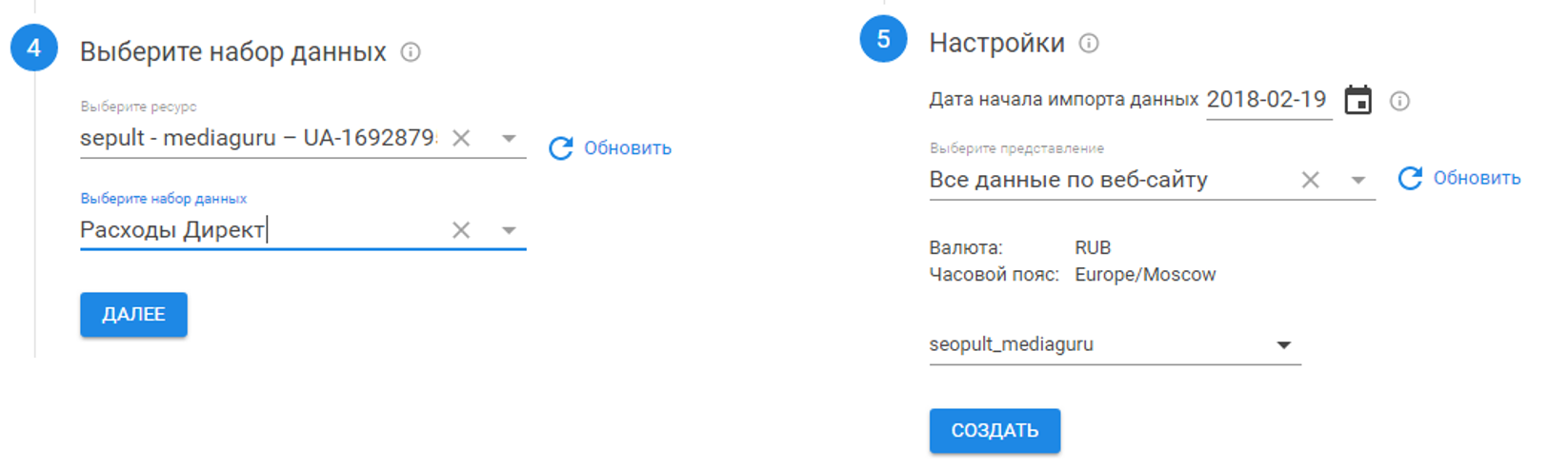5. Выбираем ресурс и набор данных, который создали на этапе настройки Google Analytics. Если набор не доступен в выпадающем списке, проверьте предыдущие шаги.