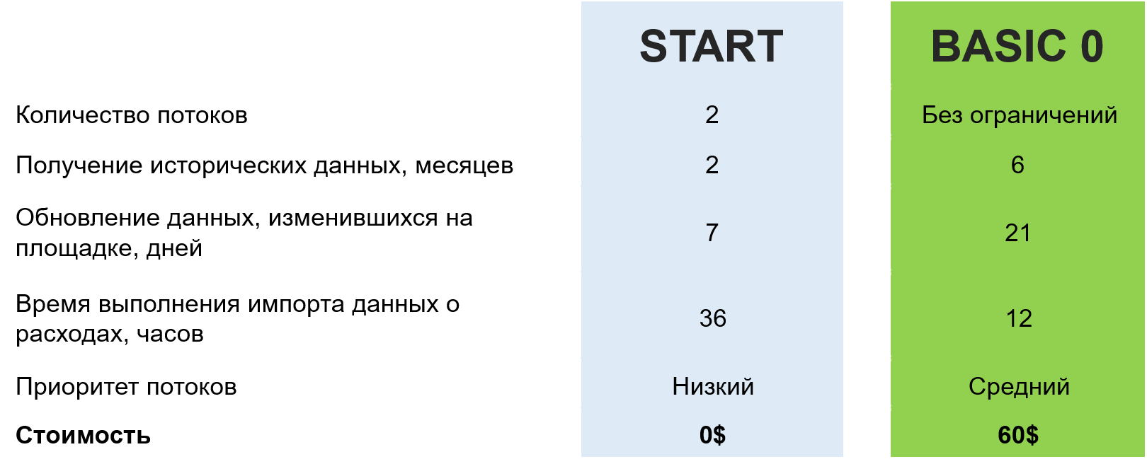 Если у вас более двух рекламных каналов, придется выбрать платный тариф — Basic 0, где нет ограничений количества потоков. - Данные в бесплатном тарифе подтягиваются за последние 2 месяца, в платном — за 6.