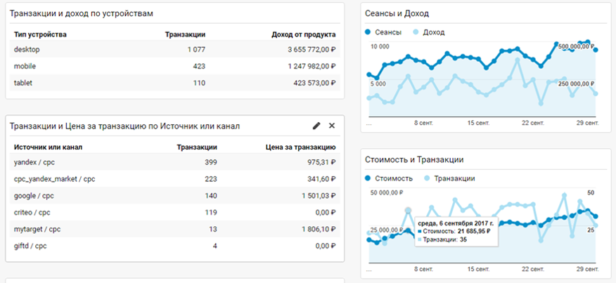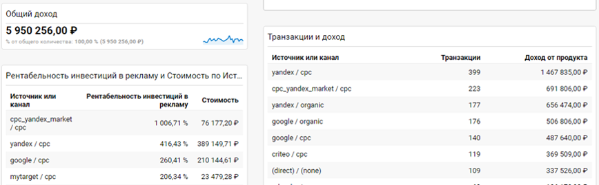 Например, соединить Яндекс, Маркет, Google, Criteo, MyTarget. Оценить рентабельность инвестиций, посмотреть цену за транзакцию по источникам и скорректировать маркетинговый бюджет.
