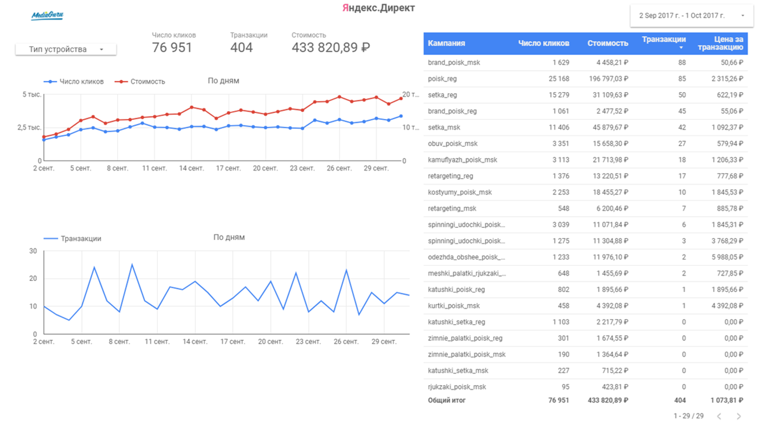 3. Создать отчет за 5 минут Google Студии данных. Наглядно посмотреть число и стоимость кликов, либо разбить по транзакциям.