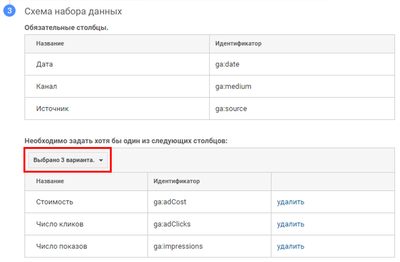 5. Добавляем поля в таблице. Первые 3 поля («дата», «канал», «источник») идут по умолчанию. Следующие — настраиваемые. Нажимаем «выбрать». Мы добавили «стоимость», «число кликов», «число показов».