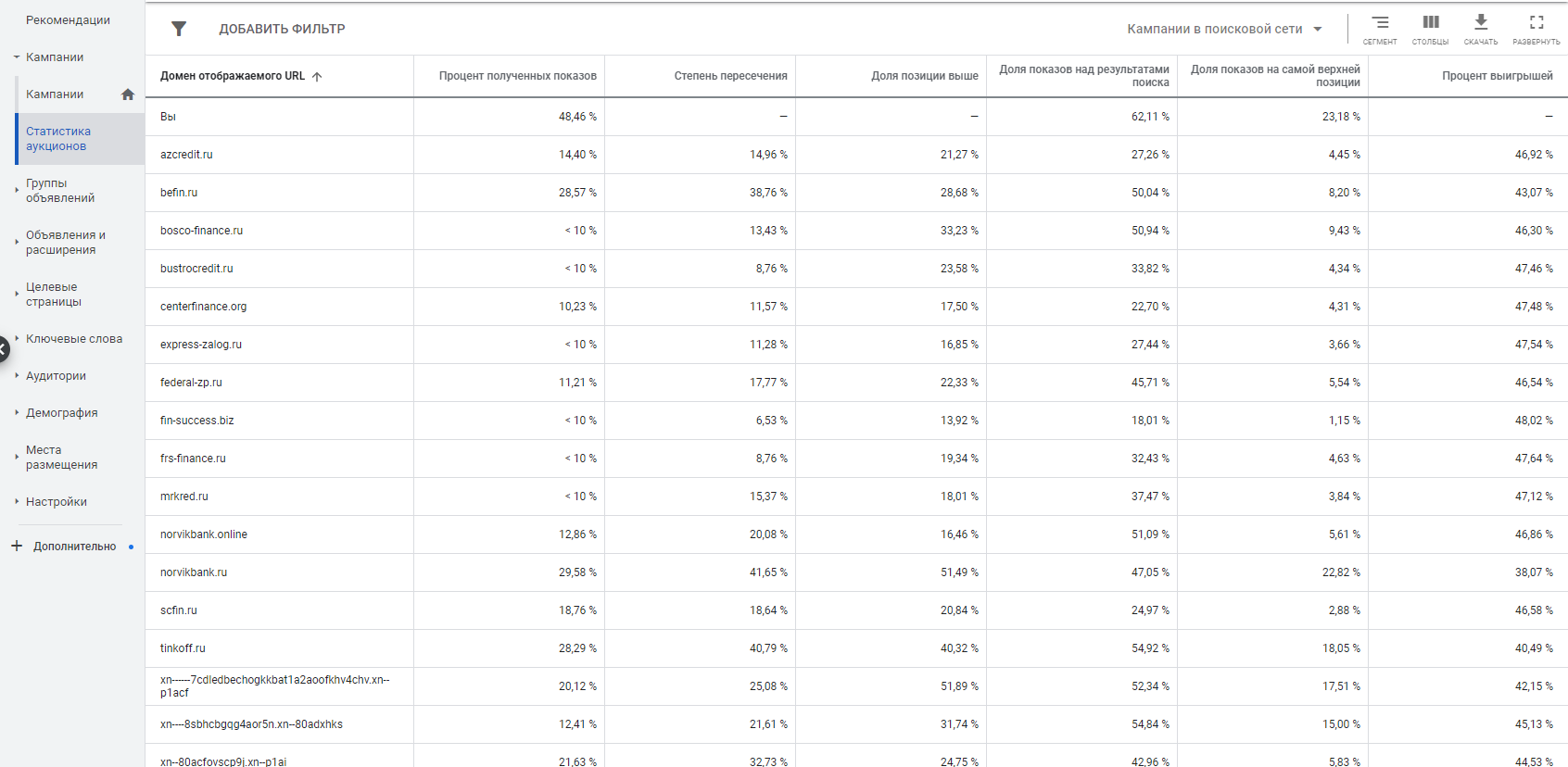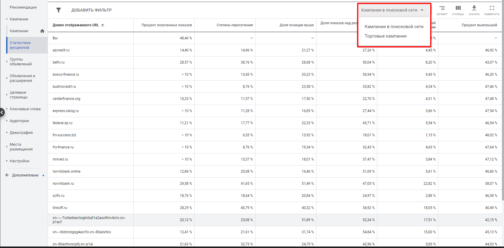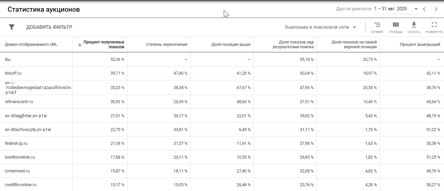 Столбец «Процент полученных показов» — это соотношение полученных показов конкретного сайта и всех показов, которые потенциально могли бы быть для него. Показы, которые мы могли бы получить, зависят от настроек таргетинга, статуса рассмотрения кампании и ее элементов и показателя качества объявлений.