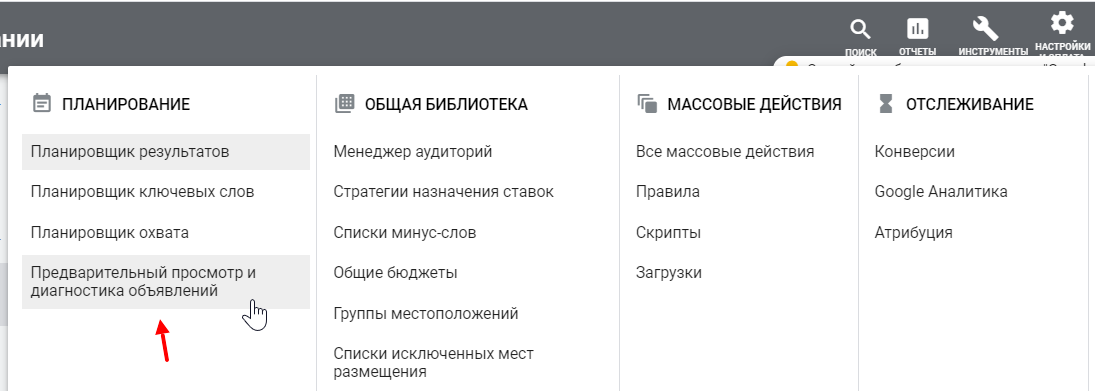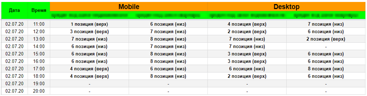 Пошли на отчаянный шаг. Времени, чтобы написать отдельный скрипт на парсинг позиций поисковой выдачи у нас не было, к тому же было непонятно, насколько такой скрипт может пригодиться в будущем, а доверять стороннему софту не стали. Поэтому построили простой отчет в Google Документах и вручную в течение трех месяцев снимали позиции через опцию «Предварительный просмотр и диагностика объявлений» внутри Google Ads.