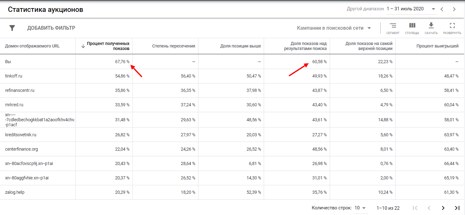 Столбец «Доля показов над результатами поиска» отражает, насколько часто ваше объявление или объявление конкурента появлялось над результатами поиска.