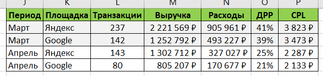 Всего за четыре месяца — с июля по октябрь 2020 года — мы протестировали более 100 разных рекламных кампаний с оплатой за конверсию для одного клиента (с которого начинали этот материал). Все они — в строке CPL в таблице ниже. Эти РК обошлись в 240 000 рублей, а доход составил 1 млн рублей!