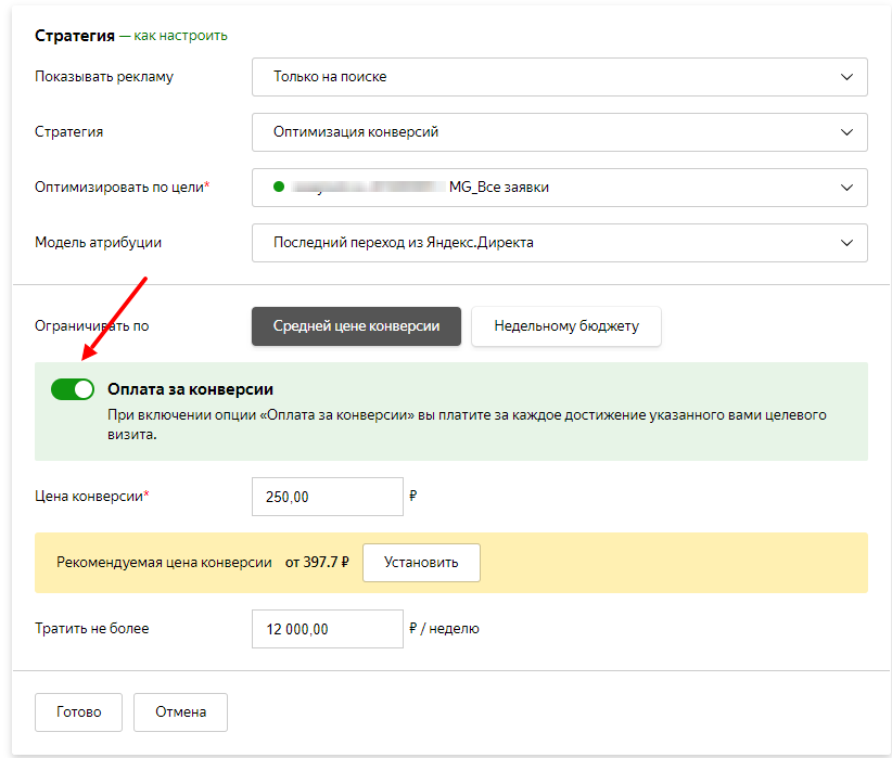 Оплата за конверсию — обязательно активируем ползунок. Он отвечает за включение этой опции.