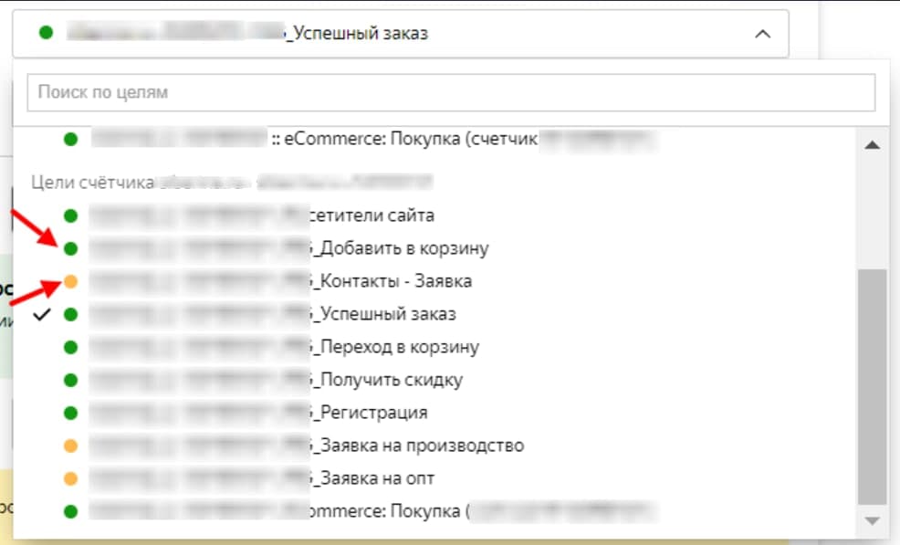 Опция «Оплата за конверсии» практически не приносит целевого трафика, если выбирать такие цели, где нет исторических данных. Узнать, по каким целям достаточно данных, просто. Заходим в настройки кампании, именно в настройки, а не в саму РК. Напротив каждой цели есть кружок: