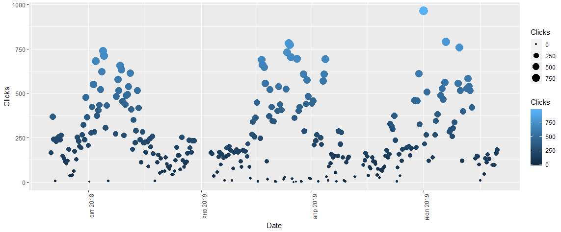 Как и Python, R позволяет удобно визуализировать результаты. Например, с помощью пакета ggplot2 можно отобразить в удобной форме графики, на которых видны важные аномалии. Ниже — график кликов по дням: