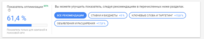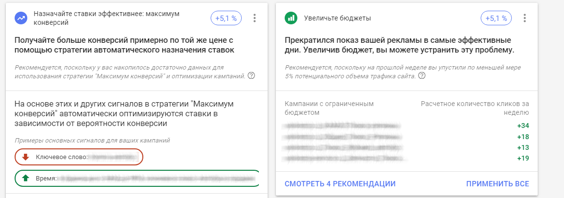 У Google есть отличие: если рекомендации Яндекса пока что идут по базовой «комплектации», то Google выдает их на основе глубокого анализа всех выставленных вами настроек, полученных конверсий, эффективности объявлений, активности поисковых запросов в сети и прочего.