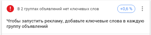 Здесь собраны все советы, нацеленные на то, чтобы ваша реклама корректно работала. Система заботливо напомнит вам привести в порядок тексты объявлений и ссылки, настроить отслеживание конверсий, проверить, не отклонила ли что-то модерация, и если да, то поможет решить эту проблему. Также покажет, в каких группах нет ключевых слов или объявлений.