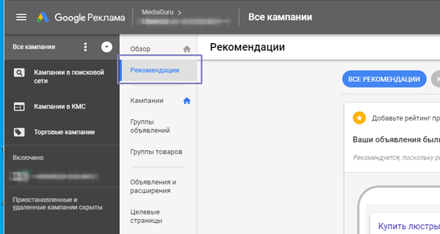 В Google Ads рекомендации находятся в меню слева: