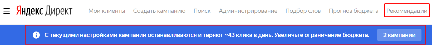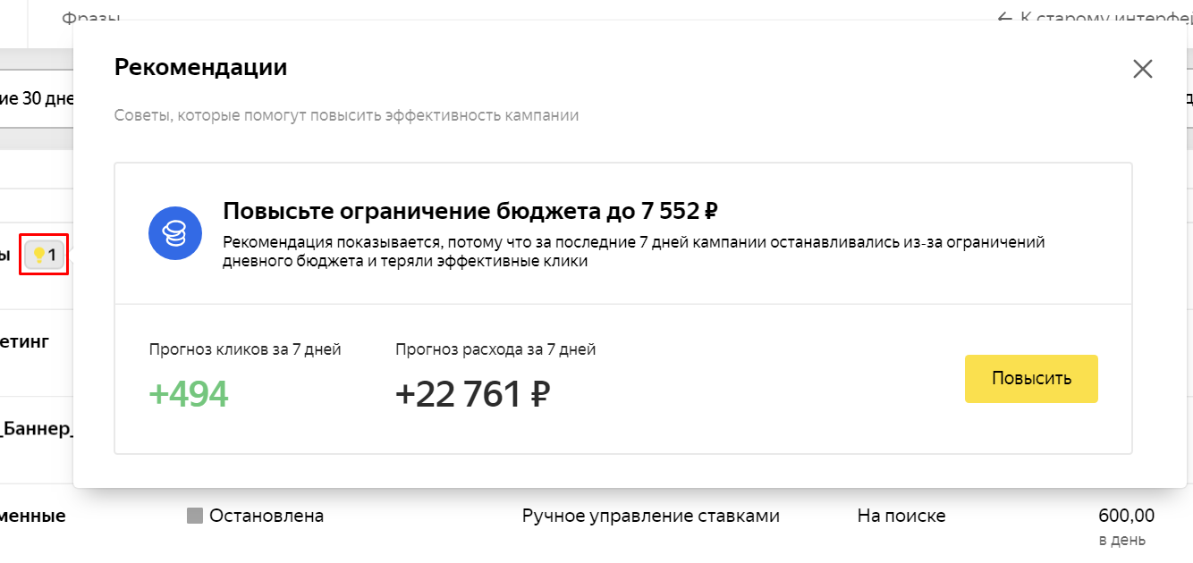 Эта рекомендация относится к тем кампаниям, которые за последние семь дней останавливались из-за ограничения бюджета. В таком случае Яндекс подсказывает, насколько нужно поднять бюджет, чтобы не терять клики.
