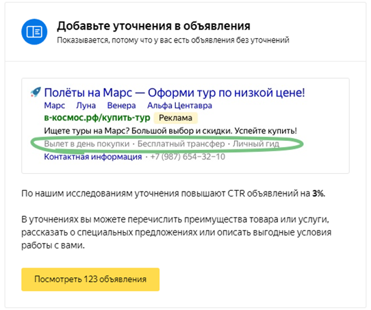Яндекс оперативно подскажет, в каких объявлениях вы не добавили эти важные расширения. Он приводит убедительную статистику своих исследований и показывает, на сколько процентов повысится CTR, если вы добавите уточнения, дополнительные ссылки или второй заголовок.