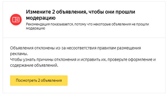 Вы сможете увидеть, какие объявления отклонила модерация, быстро отреагировать и скорректировать объявления. Удобное оповещение, особенно если у вас большой аккаунт, много кампаний и на проверку каждой уйдет много времени. Легче обратиться к рекомендациям и потратить сэкономленное время на решение проблемы.