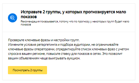 Яндекс укажет, у каких групп мало показов, а также расскажет, как убрать этот статус и заставить объявления работать. Важно попробовать каждый из перечисленных пунктов — какой-то из них точно сработает.