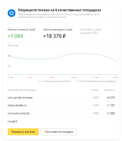 Яндекс анализирует активность пользователей на сайте и конверсионность их действий, советует вернуть рекламу на потенциально эффективную площадку, если вы отключили на ней показы. И все же перед возобновлением показов на площадке рекомендуем проверить собственные показатели на ней и убедиться, что она действительно вам нужна.