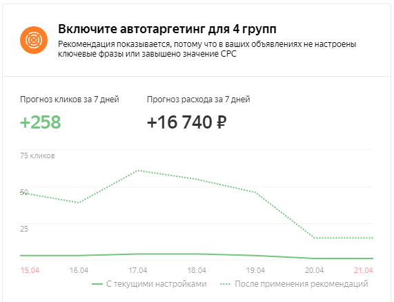 Яндекс.Директ анализирует фразы в ваших группах. Если он увидит, что некоторые запросы упущены, то предложит подключить автотаргетинг, чтобы система работала за вас, а вы не теряли показы и вместе с ними клики.
