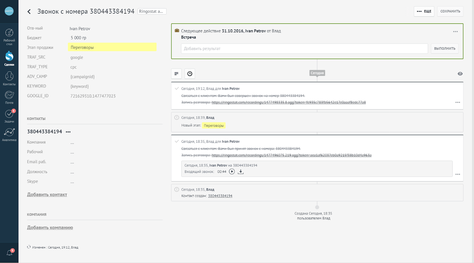 3. Инсайты о лидах. В CRM будут отображаться данные о рекламных источниках лида, вплоть до ключевого слова. Эта информация поможет понять, чего хочет собеседник и правильно построить разговор.