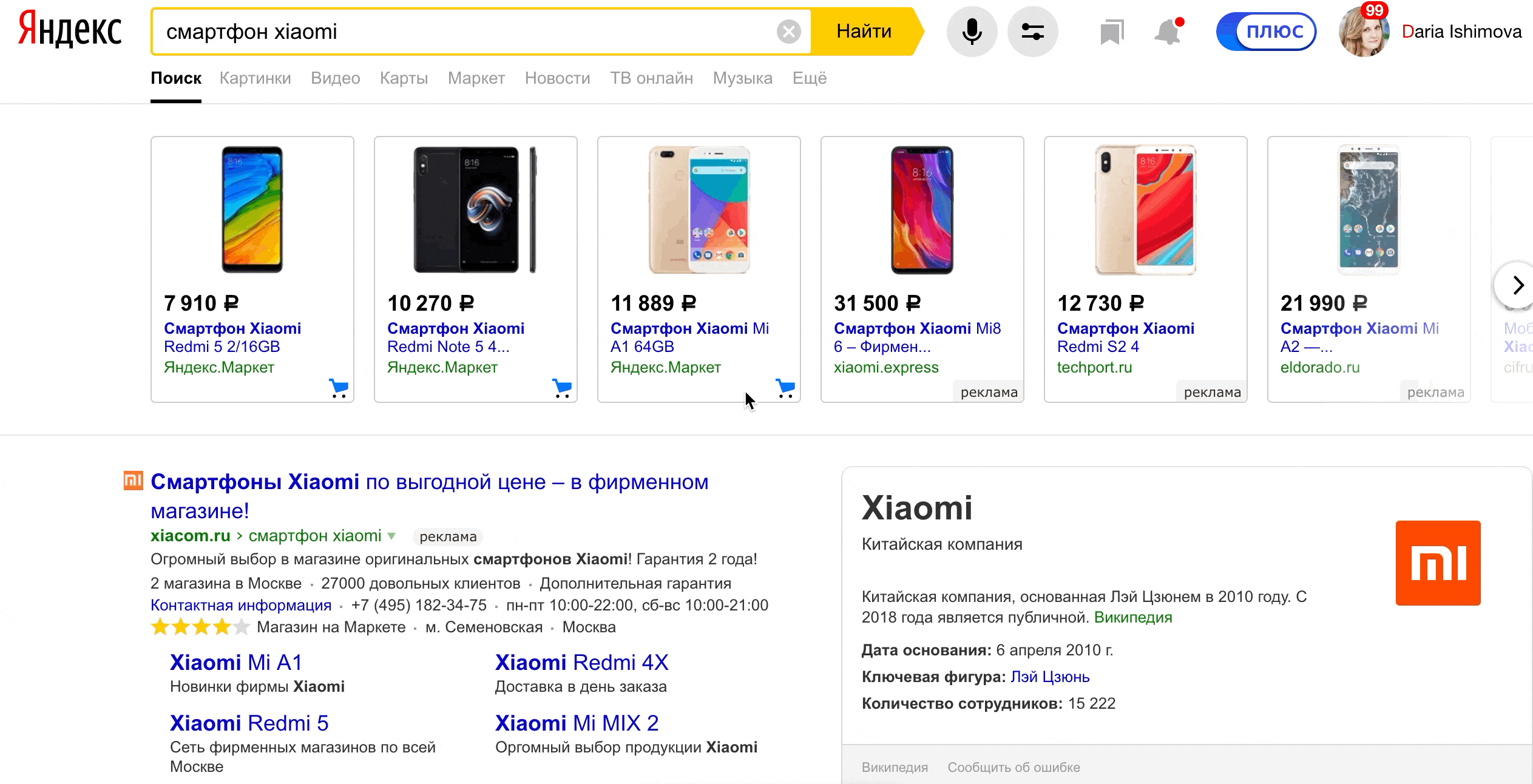 Товарная галерея над результатами поиска Яндекса