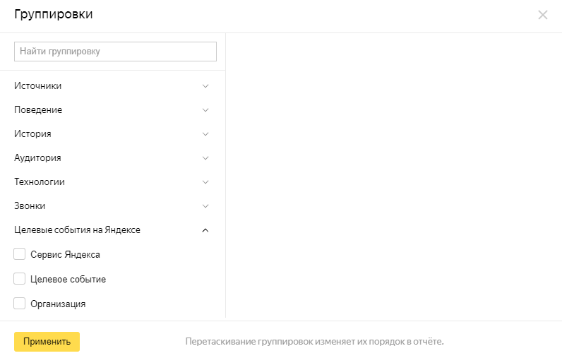 Практически в любом отчете можно перейти в меню “Группировки”. В нем будет доступен пункт “Целевые события на Яндексе”, среди которых “Сервис Яндекса”, “Целевое событие” и “Организация”.