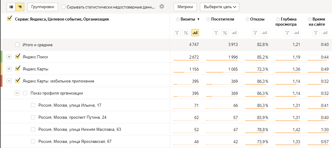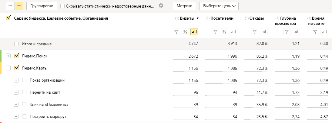 Также статистика взаимодействий есть в Яндекс.Метрике. Здесь отчеты более содержательные, рекламодателям они будут интереснее, чем статистика в Я.Справочнике.
