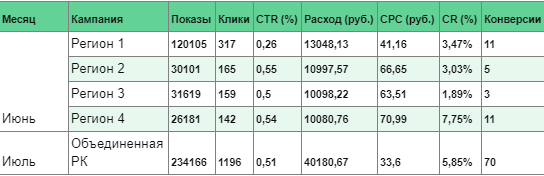 В случае недостаточного объема аудитории на самых нижних уровнях, предполагалась возможность более слабого дробления внизу воронки, однако это не понадобилось. Достаточным решением оказалось объединение регионов в рамках одной рекламной кампании.