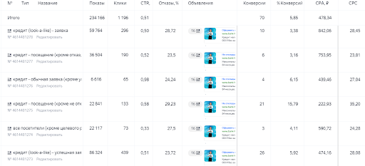 Дополнительно было принято решение объединить цели по рефинансированию кредита и обычному кредиту в единую цель, т.к. продукты очень схожи и реклама любого из этих продуктов ведет к конверсиям в обоих из них. Это дало возможность дополнительно нарастить количество конверсий без перехода на микроконверсии или какого-то иного качественного изменения в ценности конверсии.