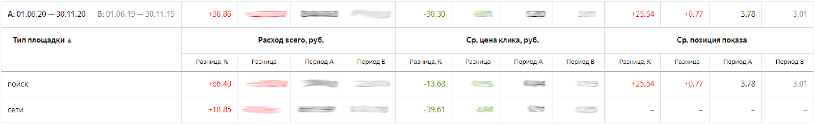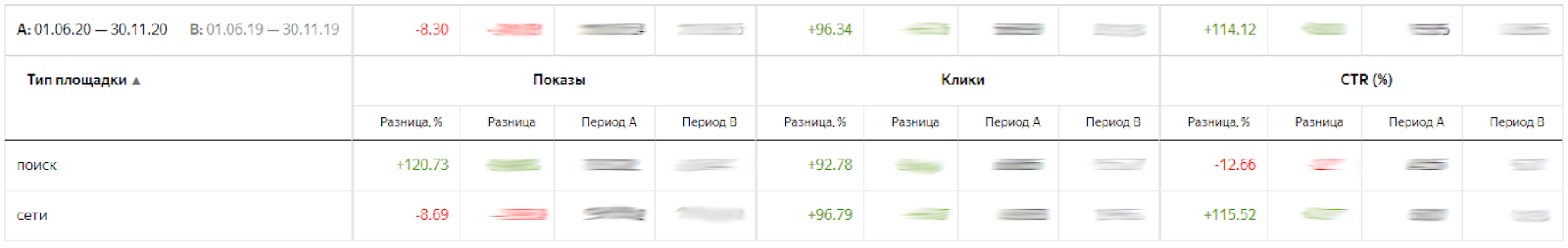 Интересно, что CTR в сетях вырос более чем в 2 раза: кликов из сетей было больше почти в 2 раза при меньшем количестве показов.