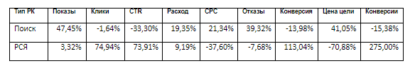 Через 3 недели 80% тестовых РК было решено оставить на автостратегиях. Любопытно, что в Директе результаты были спорные, кроме РК в РСЯ. В таблице ниже показал процентное изменение показателей в Директе за период теста: