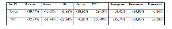 А теперь самая приятная часть. Хоть и показатель CR изменился в худшую сторону, мы получили грандиозный рост количества конверсий по более низкой цене. В РСЯ он почти достиг +40%.