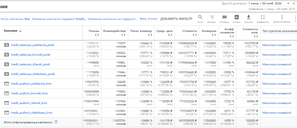 В июне 2020 клиент нарастили бюджет, и было принято решение переводить все РК в контексте на автоматическое управление ставкам, т.к. просто поднятие ставок под бюджет ранее не приводило к ожидаемым положительным результатам. Все РК в Директе также получили стратегию «оптимизация конверсий», а РК в Google Ads были переведены на «максимум конверсий», потому что перед нами стояла задача именно нарастить количество успешных заявок.