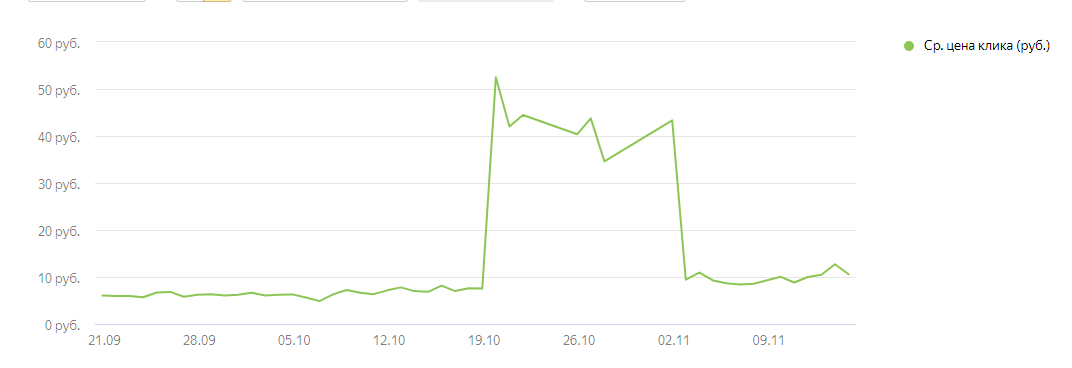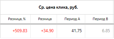4) Увеличилась цена клика с 7 руб. до 41 руб.: